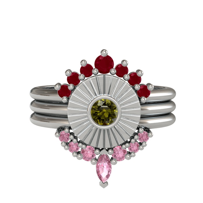 Kök yakut, peridot ve pembe kuvars 8 ayar beyaz altın yüzük