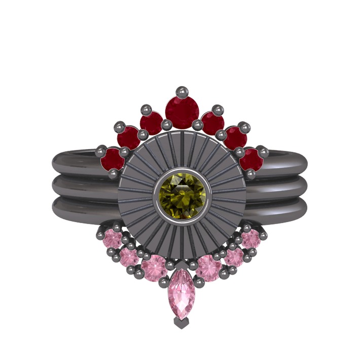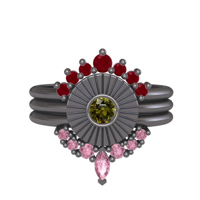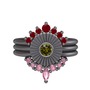 Kök yakut, peridot ve pembe kuvars 925 ayar siyah rodyum kaplama gümüş yüzük