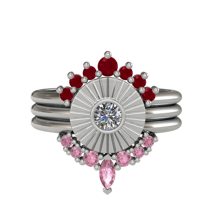 Kök yakut, pırlanta ve pembe kuvars 14 ayar beyaz altın yüzük (0.16 karat)