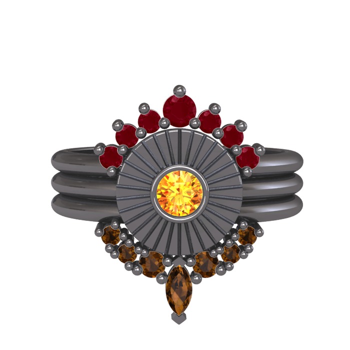 Kök yakut, sitrin ve dumanlı kuvars 925 ayar siyah rodyum kaplama gümüş yüzük
