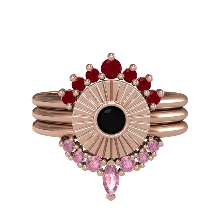 Kök yakut, siyah zirkon ve pembe kuvars 18 ayar rose altın yüzük