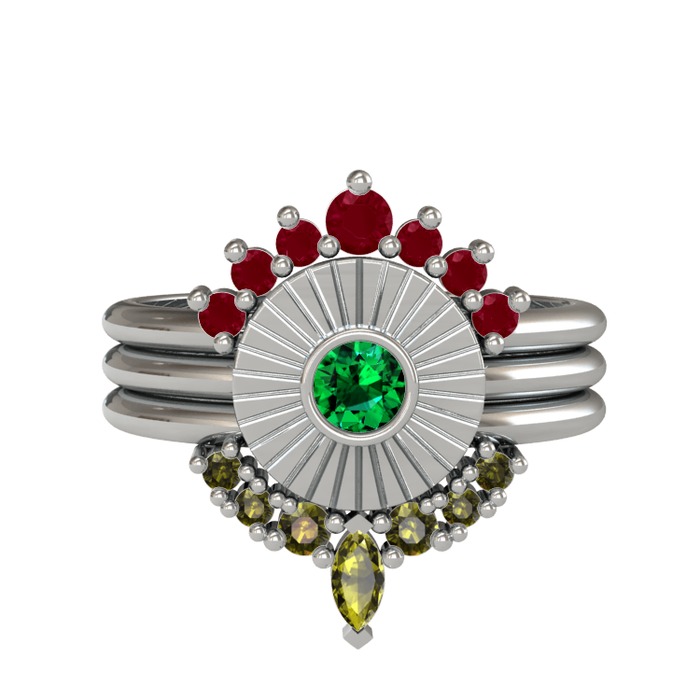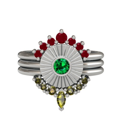 Kök yakut, yeşil kuvars ve peridot 14 ayar beyaz altın yüzük