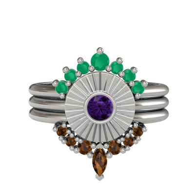 Kök zümrüt, ametist ve dumanlı kuvars 18 ayar beyaz altın yüzük