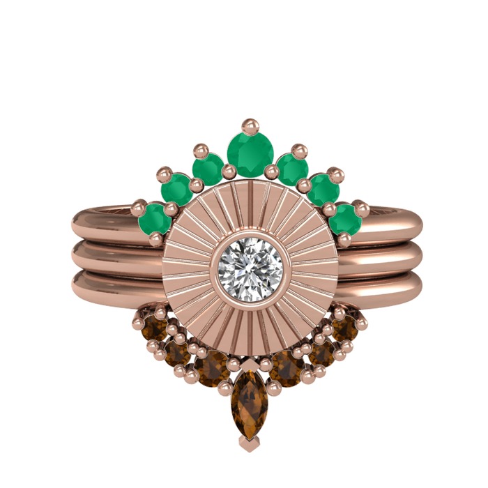 Kök zümrüt, beyaz zirkon ve dumanlı kuvars 8 ayar rose altın yüzük
