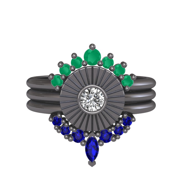 Kök zümrüt, beyaz zirkon ve lab safir 925 ayar siyah rodyum kaplama gümüş yüzük