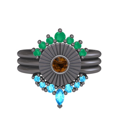 Kök zümrüt, dumanlı kuvars ve akuamarin 925 ayar siyah rodyum kaplama gümüş yüzük