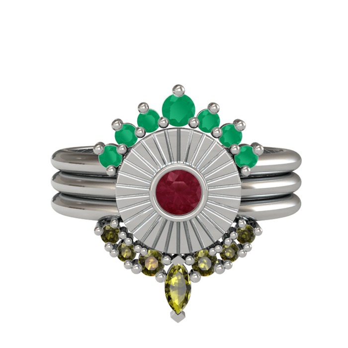Kök zümrüt, kök yakut ve peridot 14 ayar beyaz altın yüzük
