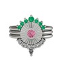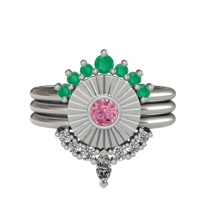 Kök zümrüt, pembe kuvars ve beyaz zirkon 8 ayar beyaz altın yüzük