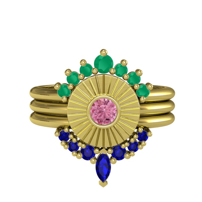 Kök zümrüt, pembe kuvars ve lab safir 8 ayar altın yüzük