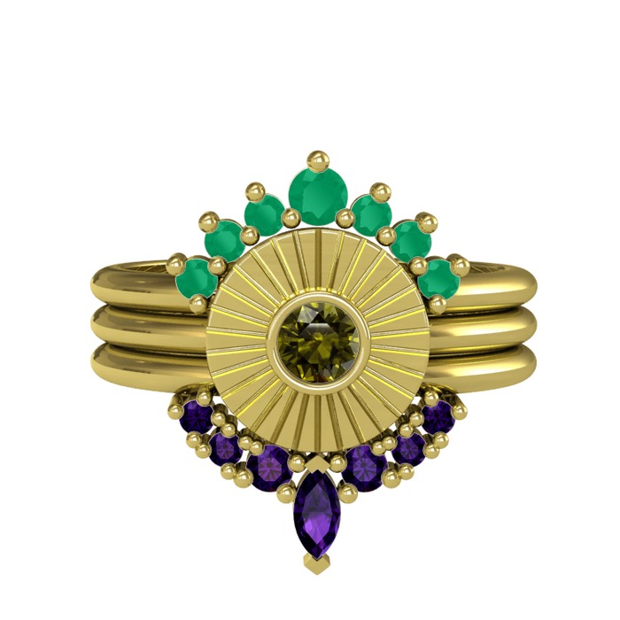 Kök zümrüt, peridot ve ametist 8 ayar altın yüzük