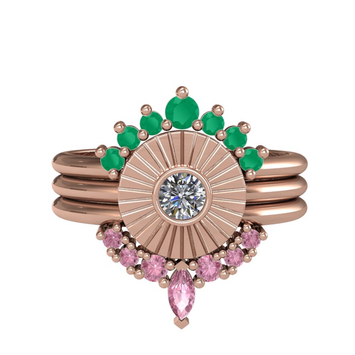 Kök zümrüt, pırlanta ve pembe kuvars 8 ayar rose altın yüzük (0.16 karat)