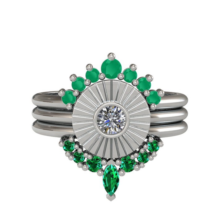Kök zümrüt, pırlanta ve yeşil kuvars 18 ayar beyaz altın yüzük (0.16 karat)