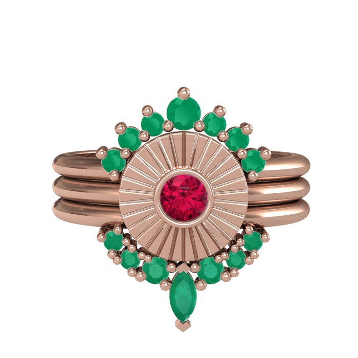 Kök zümrüt ve rodolit garnet 8 ayar rose altın yüzük