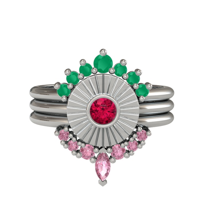 Kök zümrüt, rodolit garnet ve pembe kuvars 8 ayar beyaz altın yüzük