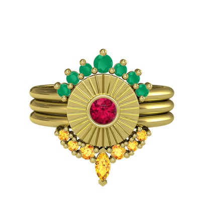 Kök zümrüt, rodolit garnet ve sitrin 925 ayar altın kaplama gümüş yüzük