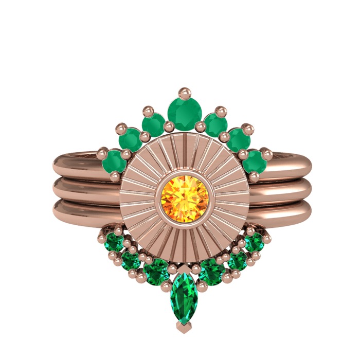 Kök zümrüt, sitrin ve yeşil kuvars 14 ayar rose altın yüzük