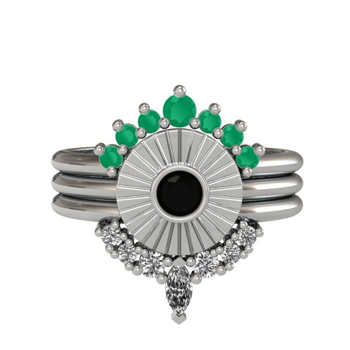 Kök zümrüt, siyah zirkon ve beyaz zirkon 14 ayar beyaz altın yüzük