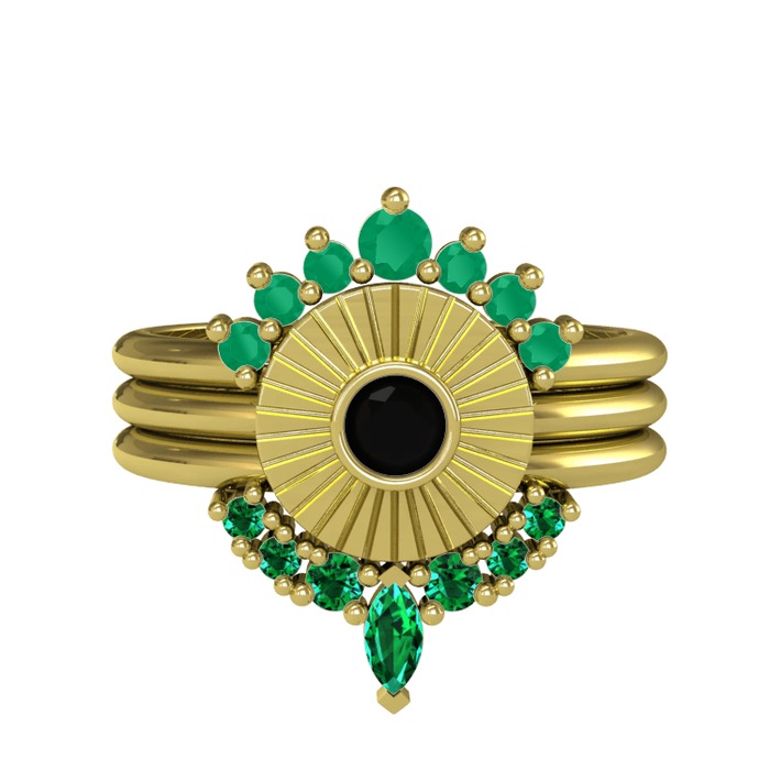 Kök zümrüt, siyah zirkon ve yeşil kuvars 18 ayar altın yüzük