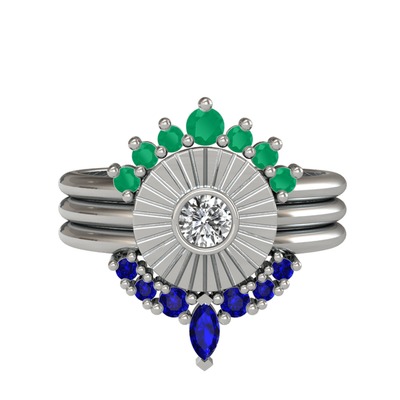 Kök zümrüt, swarovski ve lab safir 14 ayar beyaz altın yüzük