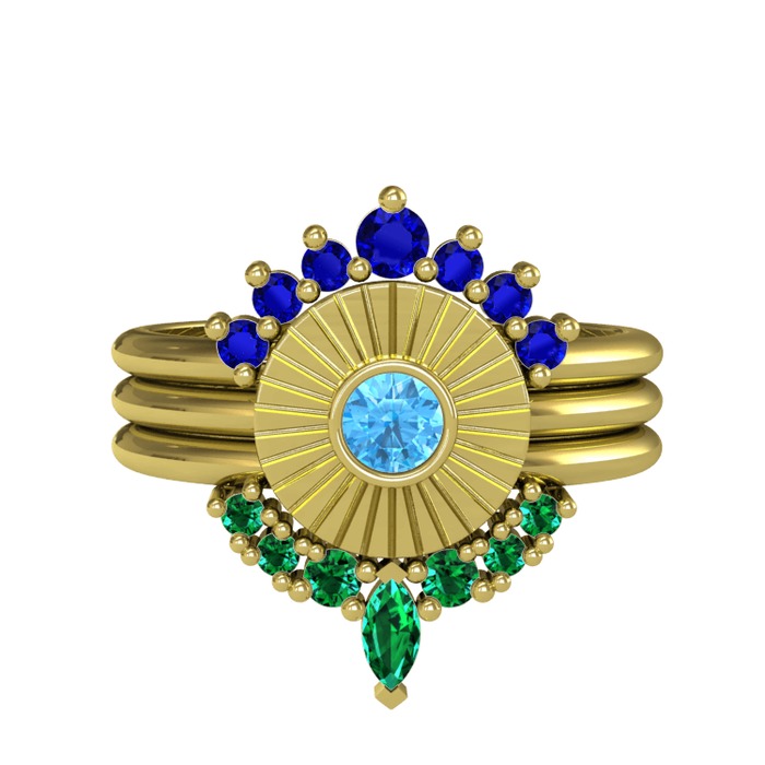 Lab safir, akuamarin ve yeşil kuvars 925 ayar altın kaplama gümüş yüzük
