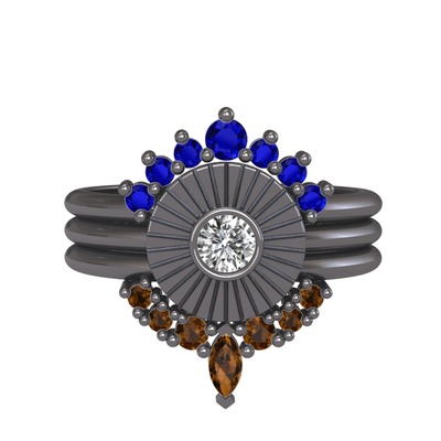 Lab safir, beyaz zirkon ve dumanlı kuvars 925 ayar siyah rodyum kaplama gümüş yüzük