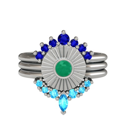 Lab safir, kök zümrüt ve akuamarin 18 ayar beyaz altın yüzük