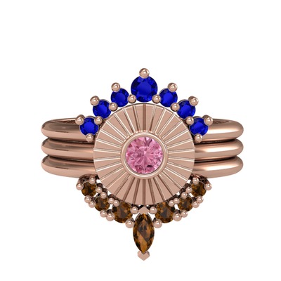 Lab safir, pembe kuvars ve dumanlı kuvars 18 ayar rose altın yüzük