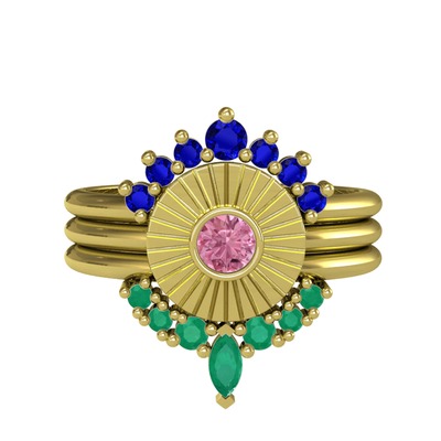 Lab safir, pembe kuvars ve kök zümrüt 925 ayar altın kaplama gümüş yüzük