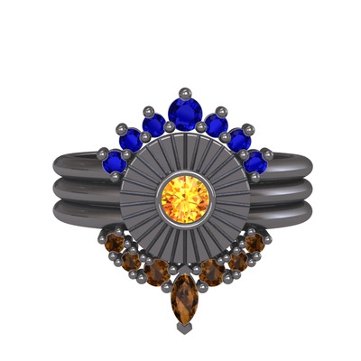 Lab safir, sitrin ve dumanlı kuvars 925 ayar siyah rodyum kaplama gümüş yüzük