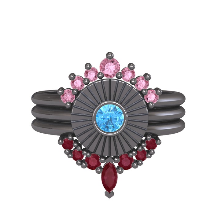 Pembe kuvars, akuamarin ve kök yakut 925 ayar siyah rodyum kaplama gümüş yüzük