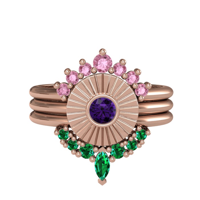 Pembe kuvars, ametist ve yeşil kuvars 8 ayar rose altın yüzük