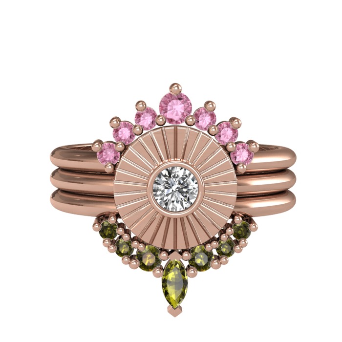 Pembe kuvars, beyaz zirkon ve peridot 925 ayar rose altın kaplama gümüş yüzük