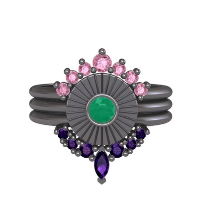 Pembe kuvars, kök zümrüt ve ametist 925 ayar siyah rodyum kaplama gümüş yüzük