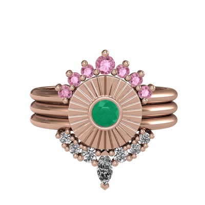 Pembe kuvars, kök zümrüt ve swarovski 18 ayar rose altın yüzük