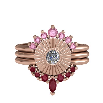 Pembe kuvars, pırlanta ve kök yakut 18 ayar rose altın yüzük (0.16 karat)
