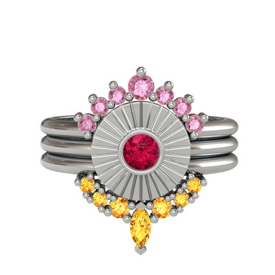 Pembe kuvars, rodolit garnet ve sitrin 14 ayar beyaz altın yüzük