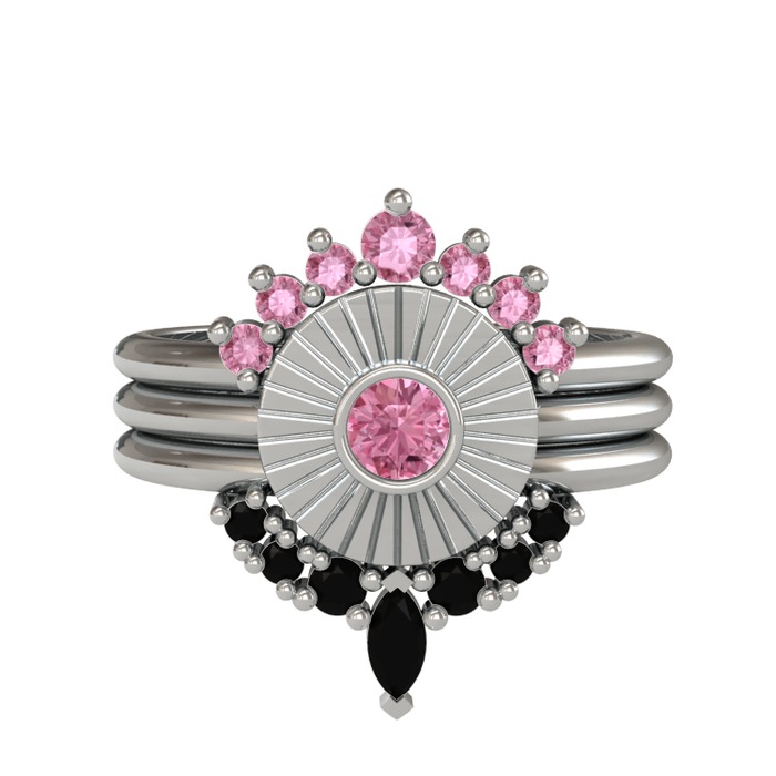 Pembe kuvars ve siyah zirkon 14 ayar beyaz altın yüzük