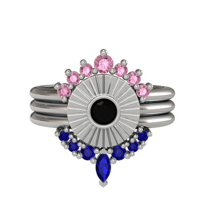 Pembe kuvars, siyah zirkon ve lab safir 14 ayar beyaz altın yüzük