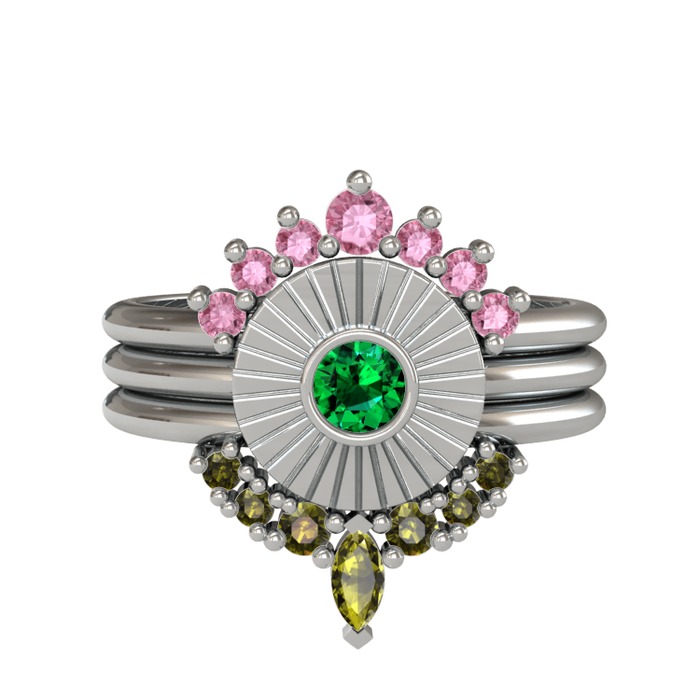 Pembe kuvars, yeşil kuvars ve peridot 14 ayar beyaz altın yüzük