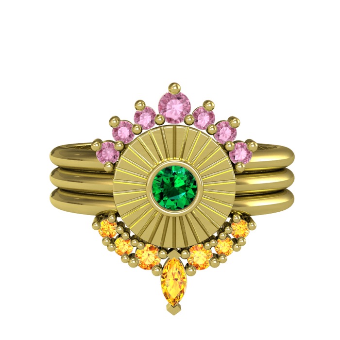 Pembe kuvars, yeşil kuvars ve sitrin 925 ayar altın kaplama gümüş yüzük