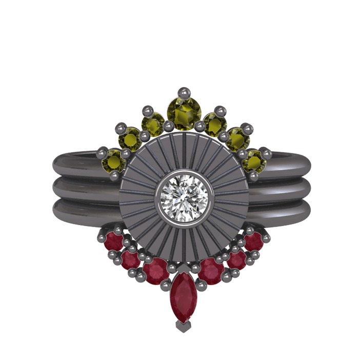 Peridot, beyaz zirkon ve kök yakut 925 ayar siyah rodyum kaplama gümüş yüzük
