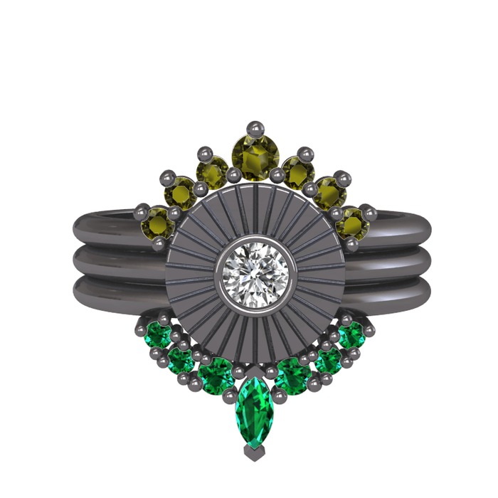 Peridot, beyaz zirkon ve yeşil kuvars 925 ayar siyah rodyum kaplama gümüş yüzük