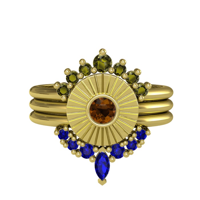 Peridot, dumanlı kuvars ve lab safir 18 ayar altın yüzük