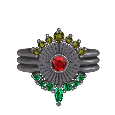 Peridot, garnet ve yeşil kuvars 925 ayar siyah rodyum kaplama gümüş yüzük