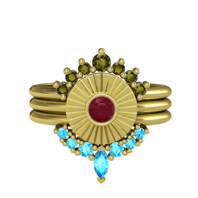 Peridot, kök yakut ve akuamarin 14 ayar altın yüzük