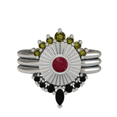 Peridot, kök yakut ve siyah zirkon 18 ayar beyaz altın yüzük