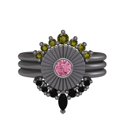 Peridot, pembe kuvars ve siyah zirkon 925 ayar siyah rodyum kaplama gümüş yüzük