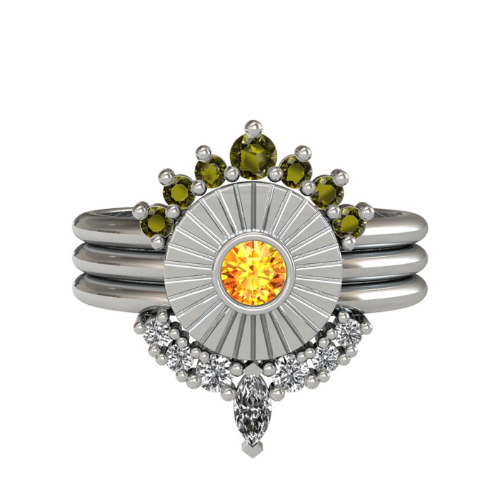 Peridot, sitrin ve beyaz zirkon 14 ayar beyaz altın yüzük