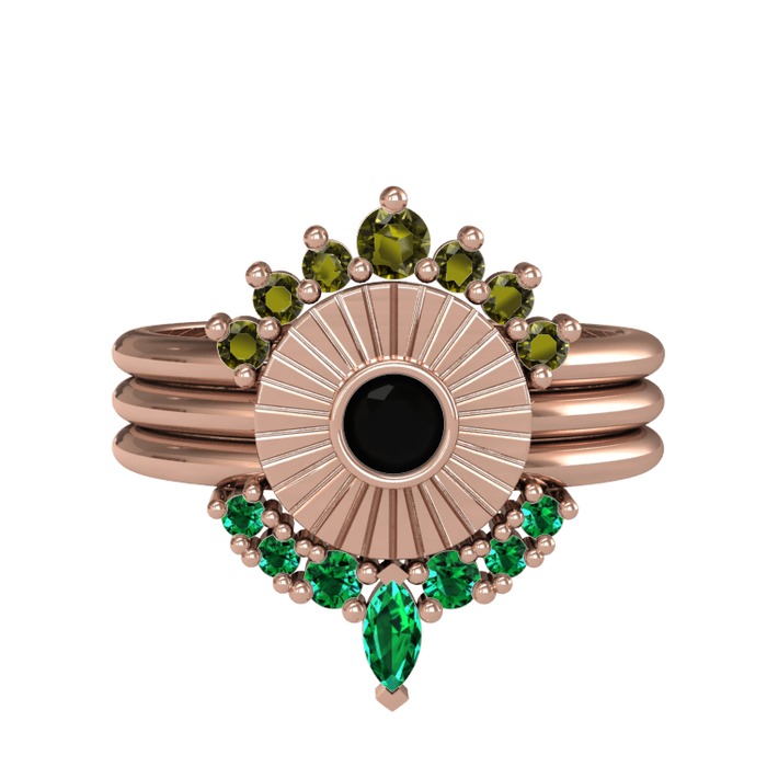 Peridot, siyah zirkon ve yeşil kuvars 14 ayar rose altın yüzük