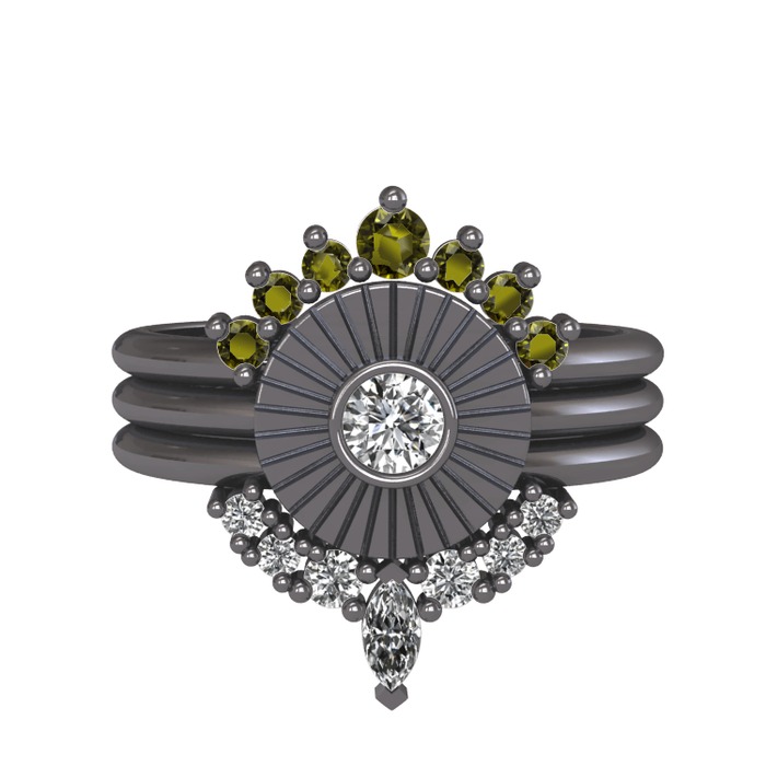 Peridot, swarovski ve beyaz zirkon 925 ayar siyah rodyum kaplama gümüş yüzük